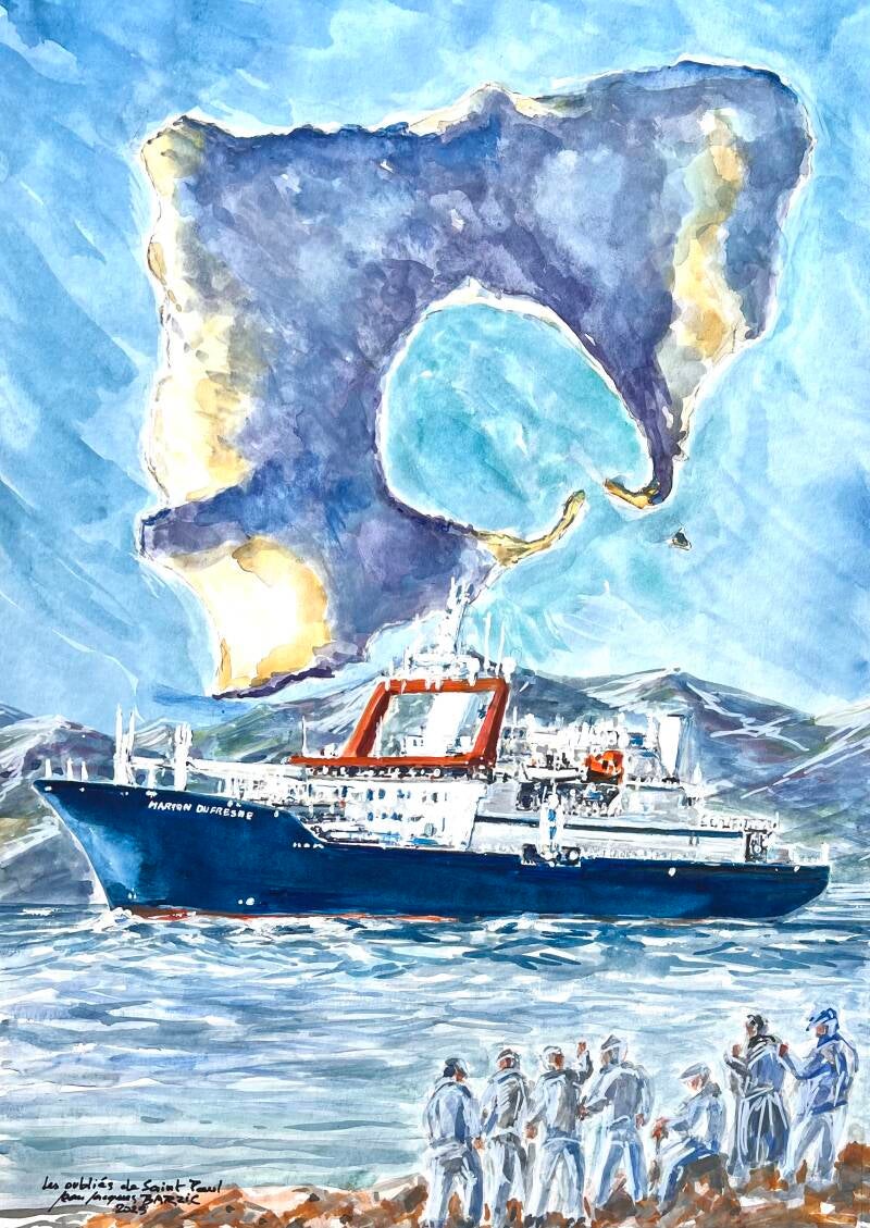 Aquarelle et gouache (53/72) présentant l'ile Saint-Paul, le navire "Marion Dufresne" et sept silhouettes rappelant les oubliés de Saint-Paul.
